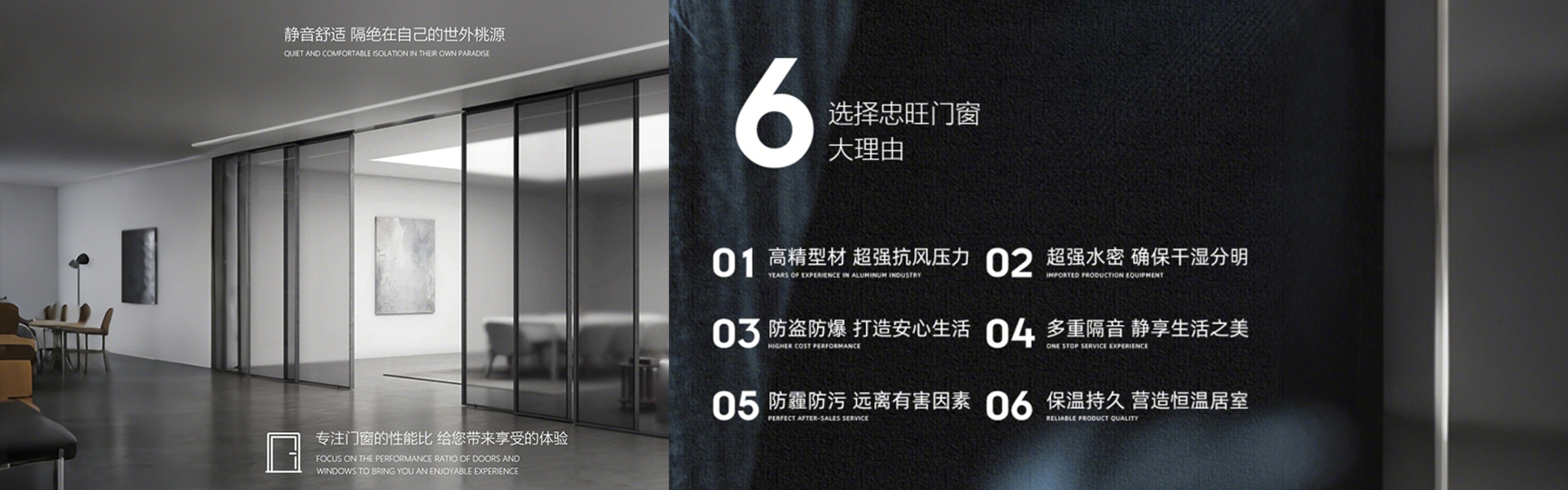 公司简介:北京忠旺系统门窗有限公司创立于2016年,是中国一家较早致力于专注定制隔音系统断桥铝合金门窗、系统窗、铝木门窗、推拉门、阳光房等集研发、生产、销售、服务为一体的现代化企业。一直秉承“求实、诚信、和谐、勤奋”的企业精神,以“社会与企业共赢”为经营理念,受到客户的一致认可。